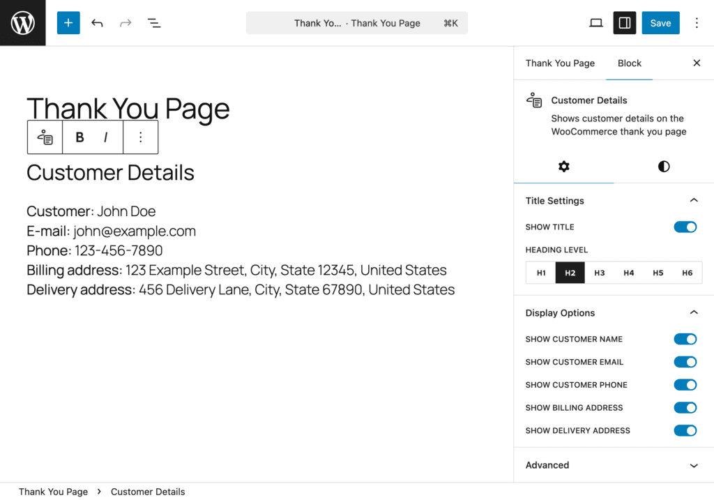 The Customer Details Block displays complete customer information including billing and shipping addresses in a formatted, easy-to-read layout.